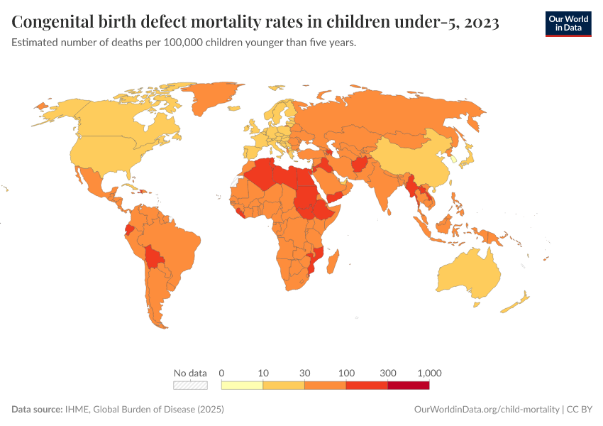 IHME, Global Burden of Disease (2024) – with minor processing by Our World in Data. “Congenital birth defect mortality rates in children under-5” [dataset]. IHME, Global Burden of Disease, “Global Burden of Disease - Deaths and DALYs” [original data]. Retrieved December 29, 2025 from https://data-forest-share-update.owid.pages.dev:8789/20250909-093708/grapher/congenital-birth-defect-mortality-rates-in-children-under-5.html (archived on September 9, 2025).