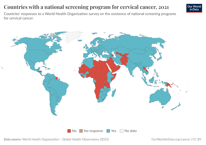World Health Organization - Global Health Observatory (2025) – processed by Our World in Data. “Countries with a national screening program for cervical cancer” [dataset]. World Health Organization, “Global Health Observatory” [original data]. Retrieved December 29, 2025 from https://data-forest-share-update.owid.pages.dev:8789/20250909-093708/grapher/countries-with-national-cervical-cancer-screening-program.html (archived on September 9, 2025).