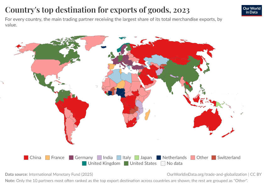 International Monetary Fund (2025) – with major processing by Our World in Data. “Top export partner category” [dataset]. International Monetary Fund, “International Trade in Goods (by partner country) (IMTS)” [original data]. Retrieved December 29, 2025 from https://data-forest-share-update.owid.pages.dev:8789/20251114-012441/grapher/countrys-top-destination-for-exports-of-goods.html (archived on November 14, 2025).