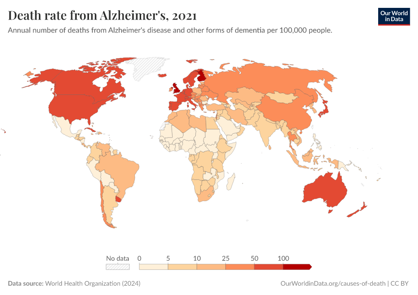 World Health Organization (2024) – with major processing by Our World in Data. “Death rate from Alzheimer's” [dataset]. World Health Organization, “Global Health Estimates” [original data]. Retrieved December 29, 2025 from https://data-forest-share-update.owid.pages.dev:8789/20250909-093708/grapher/death-rate-from-alzheimers-other-dementias-ghe.html (archived on September 9, 2025).