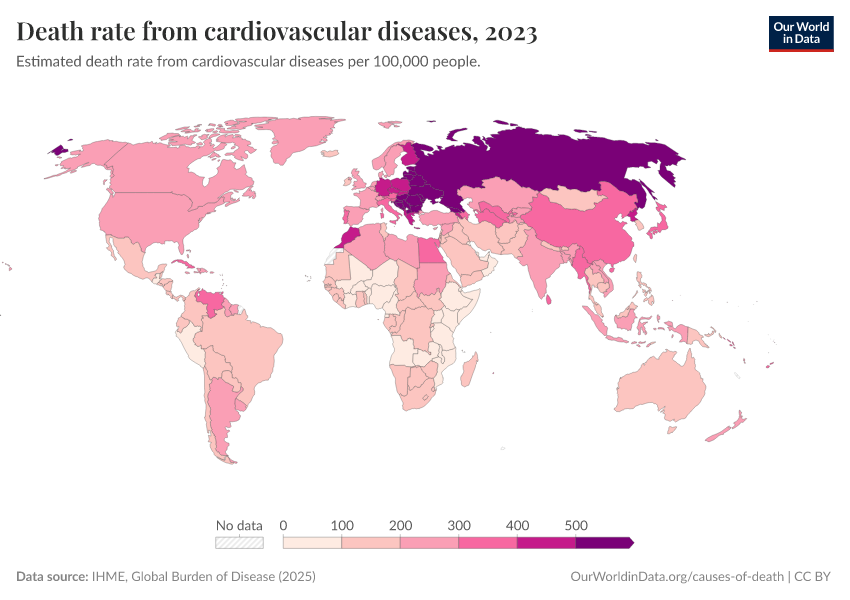 IHME, Global Burden of Disease (2024) – with minor processing by Our World in Data. “Death rate from cardiovascular diseases” [dataset]. IHME, Global Burden of Disease, “Global Burden of Disease - Deaths and DALYs” [original data]. Retrieved December 29, 2025 from https://data-forest-share-update.owid.pages.dev:8789/20250909-093708/grapher/death-rate-from-cardiovascular-diseases.html (archived on September 9, 2025).