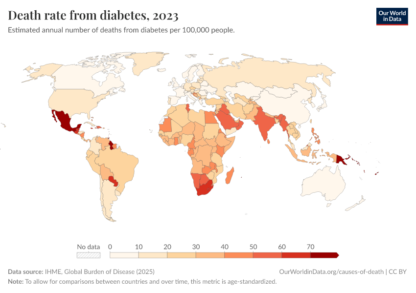 IHME, Global Burden of Disease (2024) – with minor processing by Our World in Data. “Death rate from diabetes” [dataset]. IHME, Global Burden of Disease, “Global Burden of Disease - Deaths and DALYs” [original data]. Retrieved December 29, 2025 from https://data-forest-share-update.owid.pages.dev:8789/20250909-093708/grapher/death-rate-from-diabetes.html (archived on September 9, 2025).