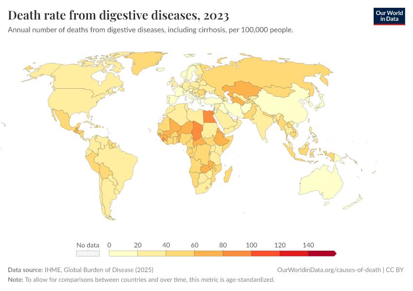 IHME, Global Burden of Disease (2024) – with minor processing by Our World in Data. “Death rate from digestive diseases” [dataset]. IHME, Global Burden of Disease, “Global Burden of Disease - Deaths and DALYs” [original data]. Retrieved December 29, 2025 from https://data-forest-share-update.owid.pages.dev:8789/20250909-093708/grapher/death-rate-from-digestive-diseases.html (archived on September 9, 2025).