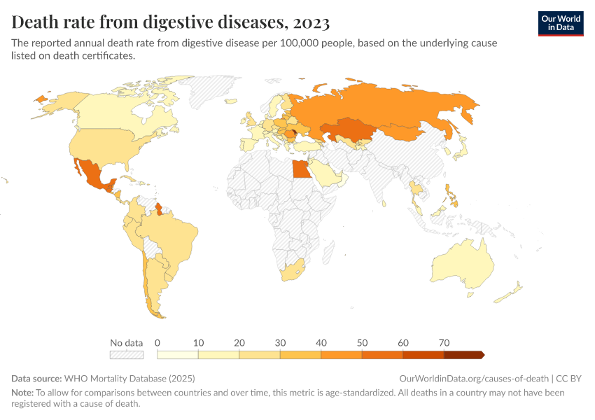 WHO Mortality Database (2025) – with minor processing by Our World in Data. “Death rate from digestive diseases” [dataset]. WHO Mortality Database, “WHO Mortality Database” [original data]. Retrieved December 29, 2025 from https://data-forest-share-update.owid.pages.dev:8789/20250909-093708/grapher/death-rate-from-digestive-diseases-who-mdb.html (archived on September 9, 2025).