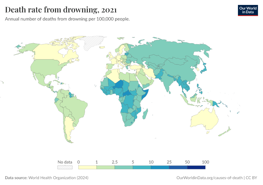 World Health Organization (2024) – with major processing by Our World in Data. “Death rate from drowning” [dataset]. World Health Organization, “Global Health Estimates” [original data]. Retrieved December 29, 2025 from https://data-forest-share-update.owid.pages.dev:8789/20250909-093708/grapher/death-rate-from-drowning-ghe.html (archived on September 9, 2025).