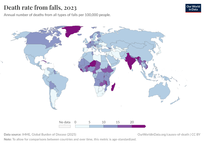 IHME, Global Burden of Disease (2024) – with minor processing by Our World in Data. “Death rate from falls” [dataset]. IHME, Global Burden of Disease, “Global Burden of Disease - Deaths and DALYs” [original data]. Retrieved December 29, 2025 from https://data-forest-share-update.owid.pages.dev:8789/20250909-093708/grapher/death-rate-from-falls-gbd.html (archived on September 9, 2025).