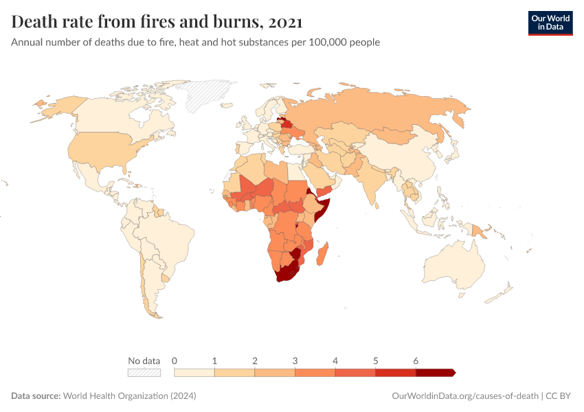 “Data Page: Death rate from fires and burns”, part of the following publication: Esteban Ortiz-Ospina and Max Roser (2016) - “Global Health”. Data adapted from World Health Organization. Retrieved from https://data-forest-share-update.owid.pages.dev:8789/20250909-093708/grapher/death-rate-from-fires-and-burns-who.html [online resource] (archived on September 9, 2025).How to cite this data