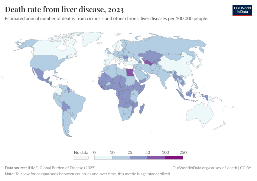 IHME, Global Burden of Disease (2024) – with minor processing by Our World in Data. “Death rate from liver disease” [dataset]. IHME, Global Burden of Disease, “Global Burden of Disease - Deaths and DALYs” [original data]. Retrieved December 29, 2025 from https://data-forest-share-update.owid.pages.dev:8789/20250909-093708/grapher/death-rate-from-liver-disease.html (archived on September 9, 2025).