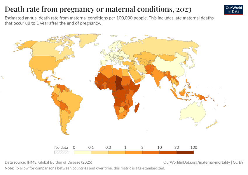 IHME, Global Burden of Disease (2024) – with minor processing by Our World in Data. “Death rate from pregnancy or maternal conditions” [dataset]. IHME, Global Burden of Disease, “Global Burden of Disease - Deaths and DALYs” [original data]. Retrieved December 29, 2025 from https://data-forest-share-update.owid.pages.dev:8789/20250909-093708/grapher/death-rate-from-maternal-disorders-ihme.html (archived on September 9, 2025).