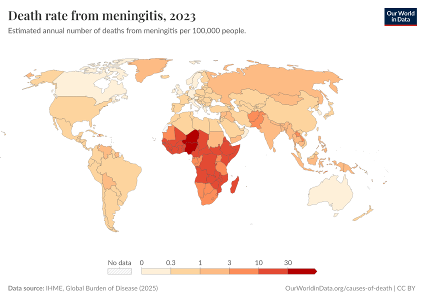 IHME, Global Burden of Disease (2024) – with minor processing by Our World in Data. “Death rate from meningitis” [dataset]. IHME, Global Burden of Disease, “Global Burden of Disease - Deaths and DALYs” [original data]. Retrieved December 29, 2025 from https://data-forest-share-update.owid.pages.dev:8789/20250909-093708/grapher/death-rate-from-meningitis-gbd.html (archived on September 9, 2025).