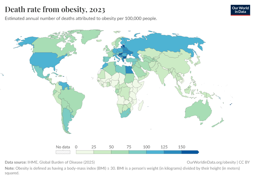 IHME, Global Burden of Disease (2024) – with minor processing by Our World in Data. “Death rate from obesity” [dataset]. IHME, Global Burden of Disease, “Global Burden of Disease - Risk Factors” [original data]. Retrieved December 29, 2025 from https://data-forest-share-update.owid.pages.dev:8789/20250909-093708/grapher/death-rate-from-obesity-gbd.html (archived on September 9, 2025).