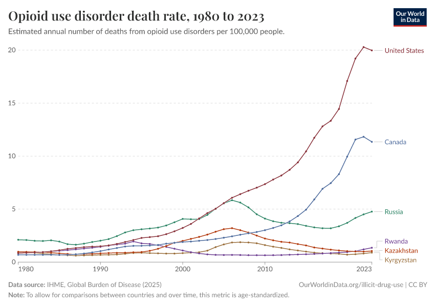 IHME, Global Burden of Disease (2024) – with minor processing by Our World in Data. “Opioid use disorder death rate” [dataset]. IHME, Global Burden of Disease, “Global Burden of Disease - Deaths and DALYs” [original data]. Retrieved December 29, 2025 from https://data-forest-share-update.owid.pages.dev:8789/20250909-093708/grapher/death-rate-from-opioid-use.html (archived on September 9, 2025).