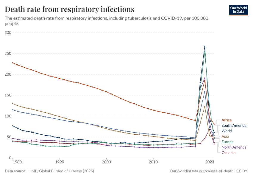IHME, Global Burden of Disease (2024) – with minor processing by Our World in Data. “Death rate from respiratory infections” [dataset]. IHME, Global Burden of Disease, “Global Burden of Disease - Deaths and DALYs” [original data]. Retrieved December 29, 2025 from https://data-forest-share-update.owid.pages.dev:8789/20250909-093708/grapher/death-rate-from-respiratory-infections-gbd.html (archived on September 9, 2025).