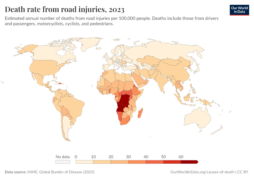 IHME, Global Burden of Disease (2024) – with minor processing by Our World in Data. “Death rate from road injuries” [dataset]. IHME, Global Burden of Disease, “Global Burden of Disease - Deaths and DALYs” [original data]. Retrieved December 29, 2025 from https://data-forest-share-update.owid.pages.dev:8789/20251126-080655/grapher/death-rate-from-road-accidents.html (archived on November 26, 2025).