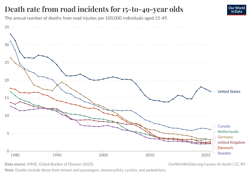 IHME, Global Burden of Disease (2024) – with minor processing by Our World in Data. “Death rate from road incidents for 15-to-49-year olds” [dataset]. IHME, Global Burden of Disease, “Global Burden of Disease - Deaths and DALYs” [original data]. Retrieved December 29, 2025 from https://data-forest-share-update.owid.pages.dev:8789/20250909-093708/grapher/death-rate-from-road-accidents-for-15--to-49-year-olds.html (archived on September 9, 2025).