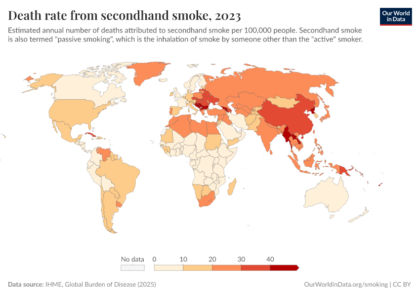 “Data Page: Death rate from secondhand smoke”, part of the following publication: Esteban Ortiz-Ospina and Max Roser (2016) - “Global Health”. Data adapted from IHME, Global Burden of Disease. Retrieved from https://data-forest-share-update.owid.pages.dev:8789/20250909-093708/grapher/death-rate-from-secondhand-smoke-gbd.html [online resource] (archived on September 9, 2025).How to cite this data