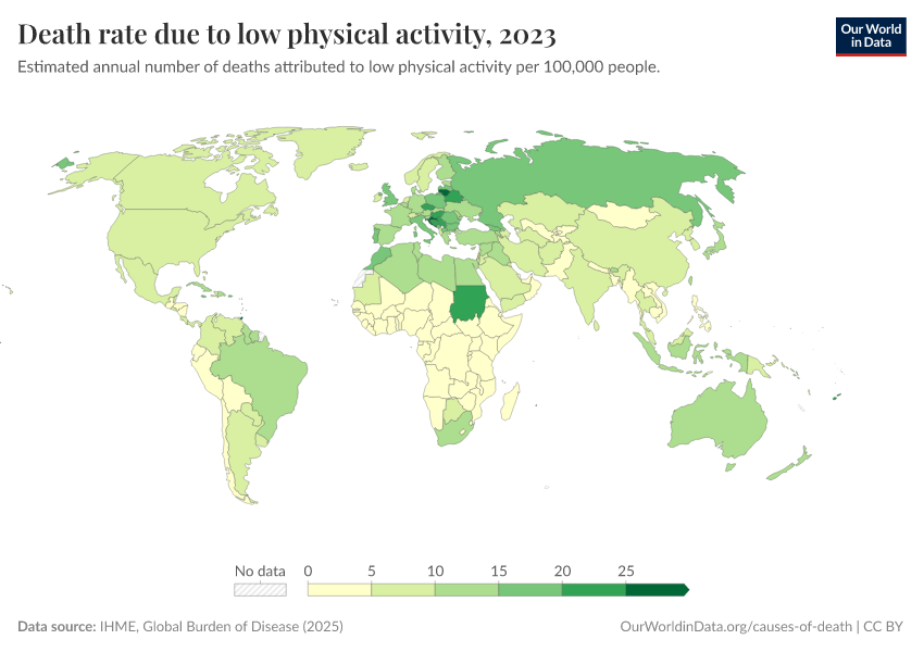 “Data Page: Death rate due to low physical activity”, part of the following publication: Esteban Ortiz-Ospina and Max Roser (2016) - “Global Health”. Data adapted from IHME, Global Burden of Disease. Retrieved from https://data-forest-share-update.owid.pages.dev:8789/20250909-093708/grapher/death-rates-due-to-low-physical-activity-gbd.html [online resource] (archived on September 9, 2025).How to cite this data
