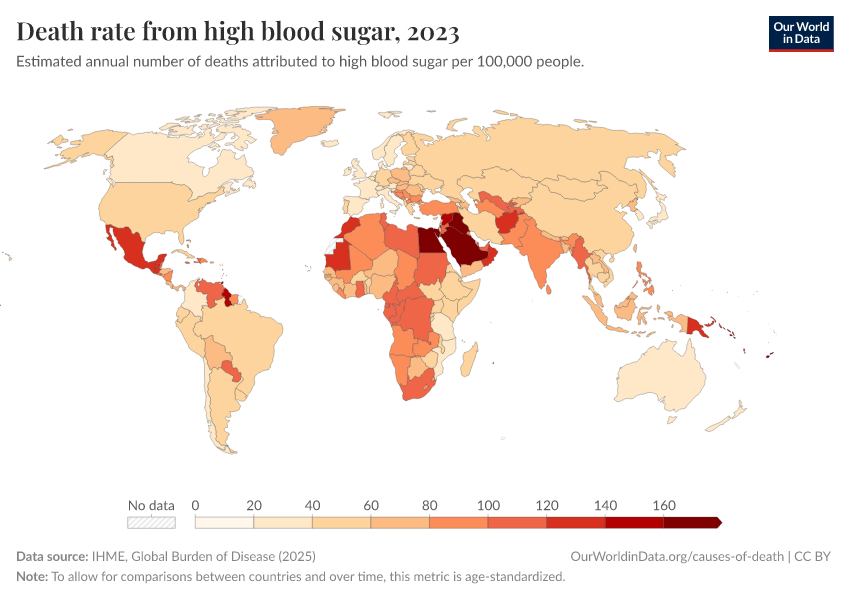 IHME, Global Burden of Disease (2024) – with minor processing by Our World in Data. “Death rate from high blood sugar” [dataset]. IHME, Global Burden of Disease, “Global Burden of Disease - Risk Factors” [original data]. Retrieved December 29, 2025 from https://data-forest-share-update.owid.pages.dev:8789/20250909-093708/grapher/death-rates-from-high-blood-sugar.html (archived on September 9, 2025).