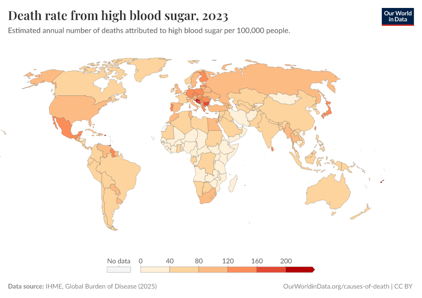 “Data Page: Death rate from high blood sugar”, part of the following publication: Esteban Ortiz-Ospina and Max Roser (2016) - “Global Health”. Data adapted from IHME, Global Burden of Disease. Retrieved from https://data-forest-share-update.owid.pages.dev:8789/20250909-093708/grapher/death-rates-from-high-blood-sugar-gbd.html [online resource] (archived on September 9, 2025).How to cite this data