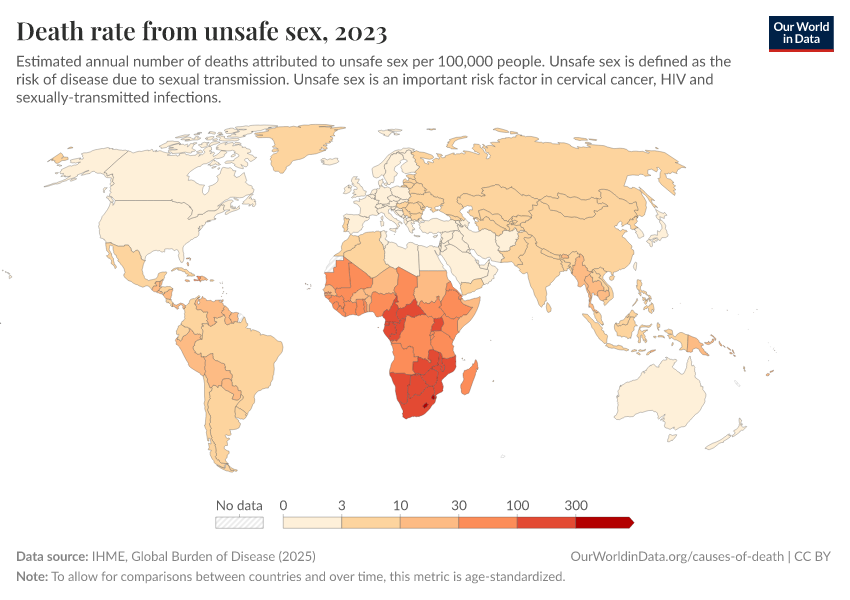 IHME, Global Burden of Disease (2024) – with minor processing by Our World in Data. “Death rate from unsafe sex” [dataset]. IHME, Global Burden of Disease, “Global Burden of Disease - Risk Factors” [original data]. Retrieved December 29, 2025 from https://data-forest-share-update.owid.pages.dev:8789/20250909-093708/grapher/death-rates-from-unsafe-sex.html (archived on September 9, 2025).
