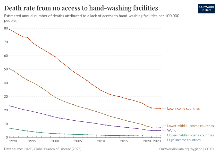 IHME, Global Burden of Disease (2024) – with minor processing by Our World in Data. “Death rate from no access to hand-washing facilities” [dataset]. IHME, Global Burden of Disease, “Global Burden of Disease - Risk Factors” [original data]. Retrieved December 29, 2025 from https://data-forest-share-update.owid.pages.dev:8789/20250909-093708/grapher/death-rates-no-handwashing.html (archived on September 9, 2025).