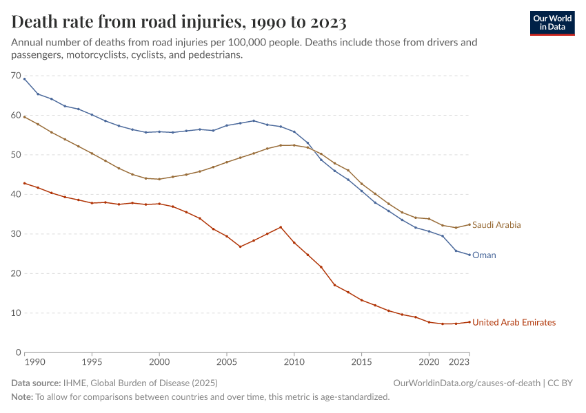 “Data Page: Death rate from road injuries”, part of the following publication: Esteban Ortiz-Ospina and Max Roser (2016) - “Global Health”. Data adapted from IHME, Global Burden of Disease. Retrieved from https://data-forest-share-update.owid.pages.dev:8789/20251029-110753/grapher/death-rates-road-incidents.html [online resource] (archived on October 29, 2025).