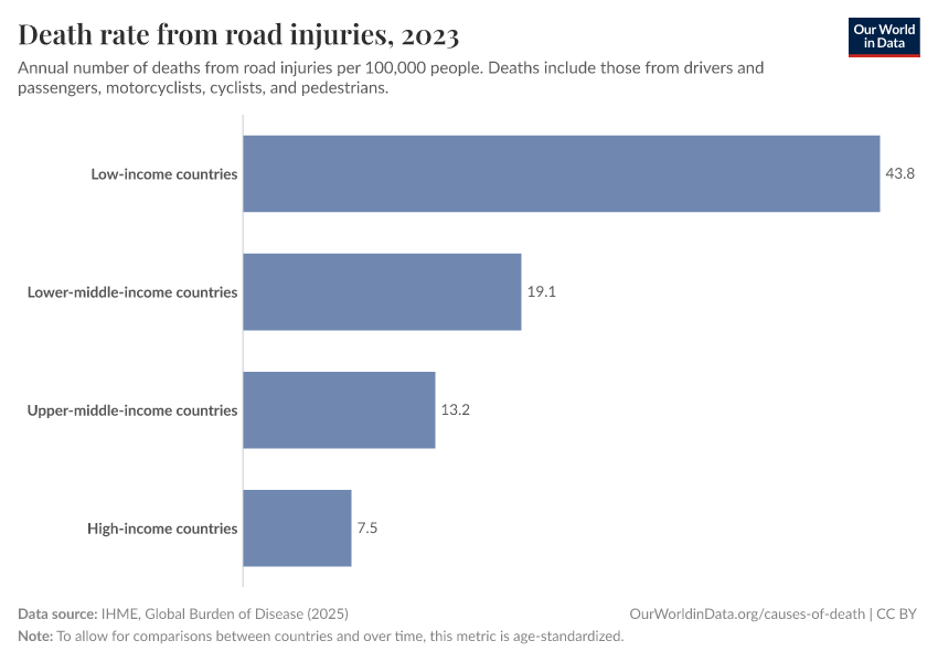 “Data Page: Death rate from road injuries”, part of the following publication: Esteban Ortiz-Ospina and Max Roser (2016) - “Global Health”. Data adapted from IHME, Global Burden of Disease. Retrieved from https://data-forest-share-update.owid.pages.dev:8789/20251029-110753/grapher/death-rates-road-incidents.html [online resource] (archived on October 29, 2025).How to cite this data