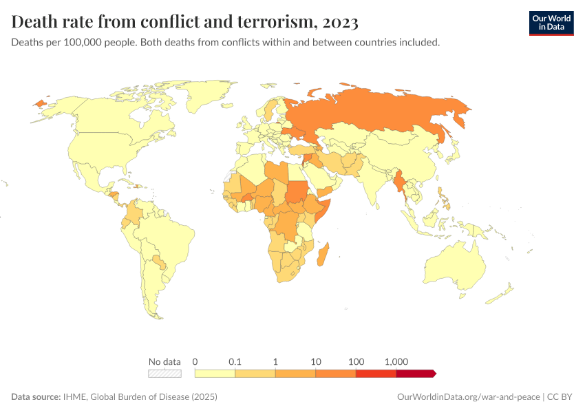 “Data Page: Death rate from conflict and terrorism”, part of the following publication: Esteban Ortiz-Ospina and Max Roser (2016) - “Global Health”. Data adapted from IHME, Global Burden of Disease. Retrieved from https://data-forest-share-update.owid.pages.dev:8789/20250909-093708/grapher/deaths-conflict-terrorism-per-100000.html [online resource] (archived on September 9, 2025).How to cite this data