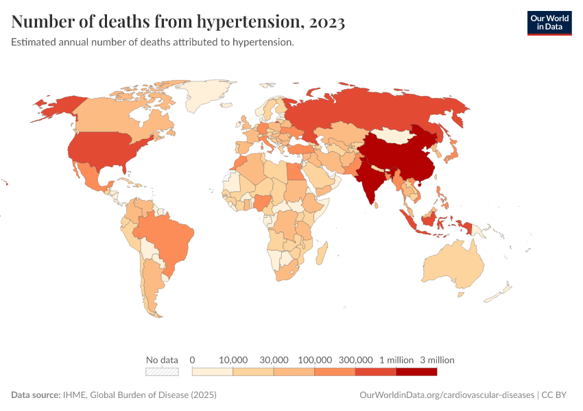 “Data Page: Number of deaths from hypertension”, part of the following publication: Esteban Ortiz-Ospina and Max Roser (2016) - “Global Health”. Data adapted from IHME, Global Burden of Disease. Retrieved from https://data-forest-share-update.owid.pages.dev:8789/20250909-093708/grapher/deaths-due-to-high-blood-pressure.html [online resource] (archived on September 9, 2025).How to cite this data