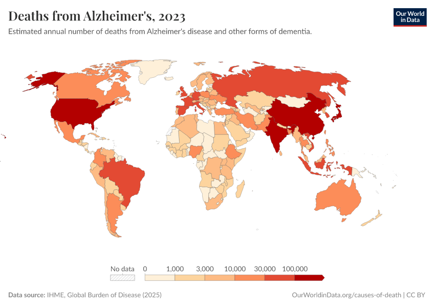 “Data Page: Deaths from Alzheimer's”, part of the following publication: Esteban Ortiz-Ospina and Max Roser (2016) - “Global Health”. Data adapted from IHME, Global Burden of Disease. Retrieved from https://data-forest-share-update.owid.pages.dev:8789/20250909-093708/grapher/deaths-from-alzheimers.html [online resource] (archived on September 9, 2025).How to cite this data