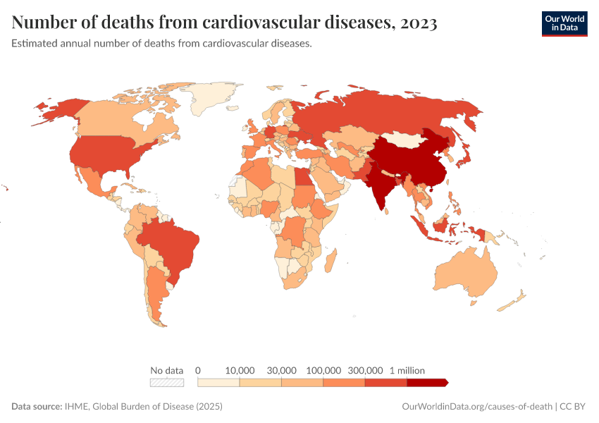 IHME, Global Burden of Disease (2024) – with minor processing by Our World in Data. “Number of deaths from cardiovascular diseases” [dataset]. IHME, Global Burden of Disease, “Global Burden of Disease - Deaths and DALYs” [original data]. Retrieved December 29, 2025 from https://data-forest-share-update.owid.pages.dev:8789/20250909-093708/grapher/deaths-from-cardiovascular-disease.html (archived on September 9, 2025).