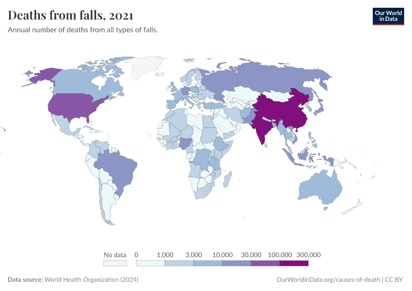 World Health Organization (2024) – with major processing by Our World in Data. “Deaths from falls” [dataset]. World Health Organization, “Global Health Estimates” [original data]. Retrieved December 29, 2025 from https://data-forest-share-update.owid.pages.dev:8789/20250909-093708/grapher/deaths-from-falls.html (archived on September 9, 2025).