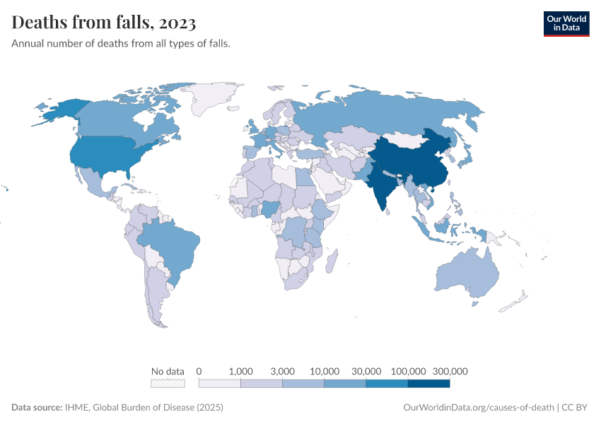IHME, Global Burden of Disease (2024) – with minor processing by Our World in Data. “Deaths from falls” [dataset]. IHME, Global Burden of Disease, “Global Burden of Disease - Deaths and DALYs” [original data]. Retrieved December 29, 2025 from https://data-forest-share-update.owid.pages.dev:8789/20250909-093708/grapher/deaths-from-falls-gbd.html (archived on September 9, 2025).