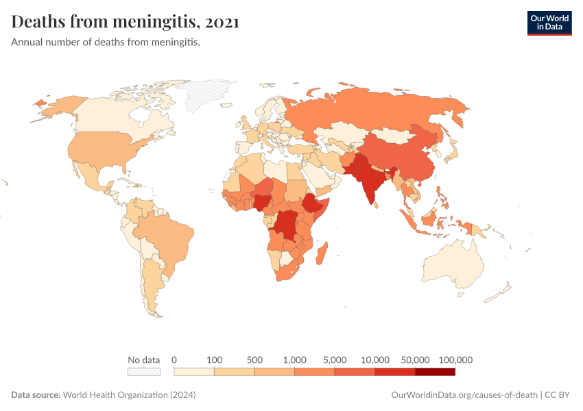 World Health Organization (2024) – with major processing by Our World in Data. “Deaths from meningitis” [dataset]. World Health Organization, “Global Health Estimates” [original data]. Retrieved December 29, 2025 from https://data-forest-share-update.owid.pages.dev:8789/20250909-093708/grapher/deaths-from-meningitis-ghe.html (archived on September 9, 2025).
