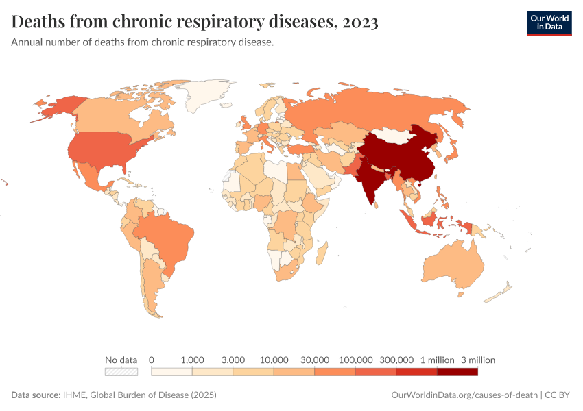 IHME, Global Burden of Disease (2024) – with minor processing by Our World in Data. “Deaths from chronic respiratory diseases” [dataset]. IHME, Global Burden of Disease, “Global Burden of Disease - Deaths and DALYs” [original data]. Retrieved December 29, 2025 from https://data-forest-share-update.owid.pages.dev:8789/20250909-093708/grapher/deaths-from-respiratory-disease.html (archived on September 9, 2025).
