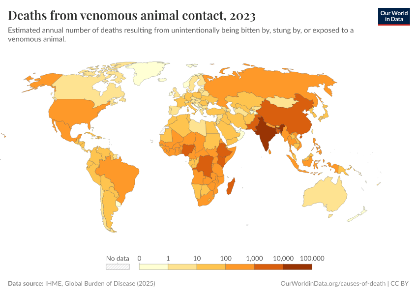 “Data Page: Deaths from venomous animal contact”, part of the following publication: Esteban Ortiz-Ospina and Max Roser (2016) - “Global Health”. Data adapted from IHME, Global Burden of Disease. Retrieved from https://data-forest-share-update.owid.pages.dev:8789/20250909-093708/grapher/deaths-from-venomous-animal-contact.html [online resource] (archived on September 9, 2025).How to cite this data