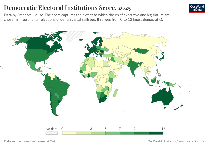 Freedom House (2025) – processed by Our World in Data. “Democratic electoral institutions score” [dataset]. Freedom House, “Freedom in the World” [original data]. Retrieved December 29, 2025 from https://data-forest-share-update.owid.pages.dev:8789/20250909-093708/grapher/democratic-electoral-institutions-fh.html (archived on September 9, 2025).