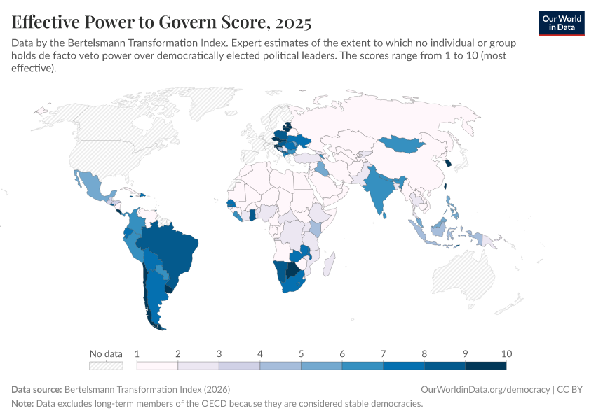 “Data Page: Effective power to govern score”, part of the following publication: Bastian Herre, Lucas Rodés-Guirao, and Esteban Ortiz-Ospina (2013) - “Democracy”. Data adapted from Bertelsmann Transformation Index. Retrieved from https://data-forest-share-update.owid.pages.dev:8789/20251209-133038/grapher/effective-power-to-govern-score-bti.html [online resource] (archived on December 9, 2025).How to cite this data