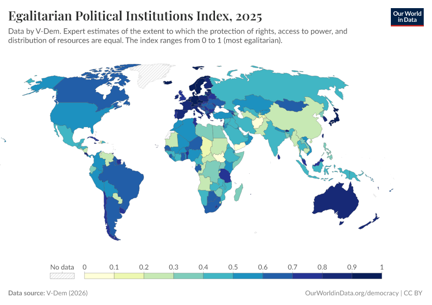 “Data Page: Egalitarian political institutions index”, part of the following publication: Bastian Herre, Lucas Rodés-Guirao, and Esteban Ortiz-Ospina (2013) - “Democracy”. Data adapted from V-Dem. Retrieved from https://data-forest-share-update.owid.pages.dev:8789/20251209-133038/grapher/egalitarian-political-institutions-index.html [online resource] (archived on December 9, 2025).How to cite this data