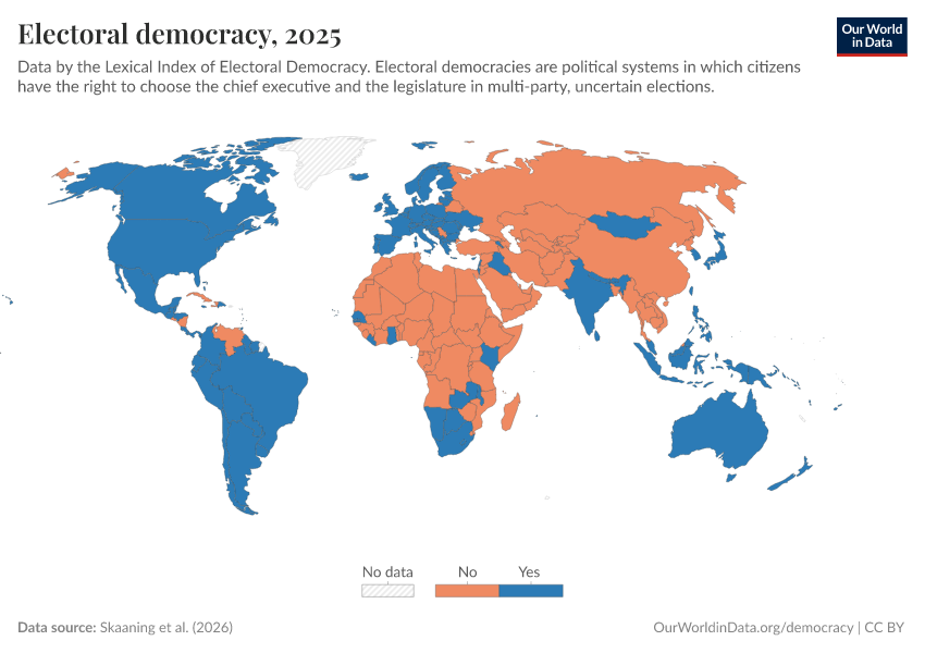 Skaaning et al. (2025) – processed by Our World in Data. “Electoral democracy” [dataset]. Skaaning et al., “Lexical Index of Electoral Democracy (LIED) v6.8” [original data]. Retrieved December 29, 2025 from https://data-forest-share-update.owid.pages.dev:8789/20250909-093708/grapher/electoral-democracy-lexical.html (archived on September 9, 2025).
