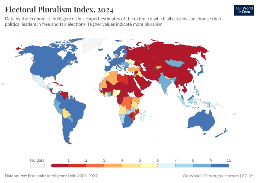 Economist Intelligence Unit (2006-2024) – processed by Our World in Data. “Electoral Pluralism Index” [dataset]. Economist Intelligence Unit, “Democracy Index 2021: The China challenge”; Economist Intelligence Unit, “Democracy Index 2022: Frontline democracy and the battle for Ukraine”; Economist Intelligence Unit, “Democracy Index 2023: Age of Conflict”; Economist Intelligence Unit, “Democracy Index 2024: What's wrong with representative democracy?”; Gapminder, “Democracy Index v4”; Various sources, “Population” [original data]. Retrieved December 29, 2025 from https://data-forest-share-update.owid.pages.dev:8789/20251209-133038/grapher/electoral-pluralism-index-eiu.html (archived on December 9, 2025).