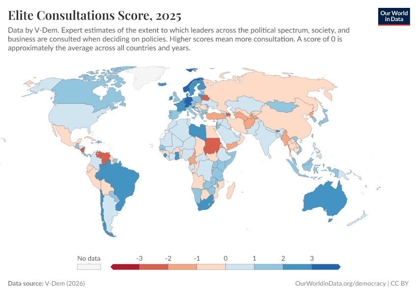 “Data Page: Elite consultation”, part of the following publication: Bastian Herre, Lucas Rodés-Guirao, and Esteban Ortiz-Ospina (2013) - “Democracy”. Data adapted from V-Dem. Retrieved from https://data-forest-share-update.owid.pages.dev:8789/20250925-233948/grapher/elite-consultations-score.html [online resource] (archived on September 25, 2025).How to cite this data