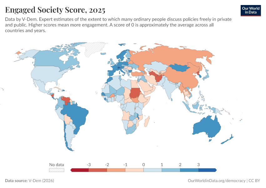 “Data Page: Engaged society”, part of the following publication: Bastian Herre, Lucas Rodés-Guirao, and Esteban Ortiz-Ospina (2013) - “Democracy”. Data adapted from V-Dem. Retrieved from https://data-forest-share-update.owid.pages.dev:8789/20250925-233948/grapher/engaged-society-score.html [online resource] (archived on September 25, 2025).How to cite this data