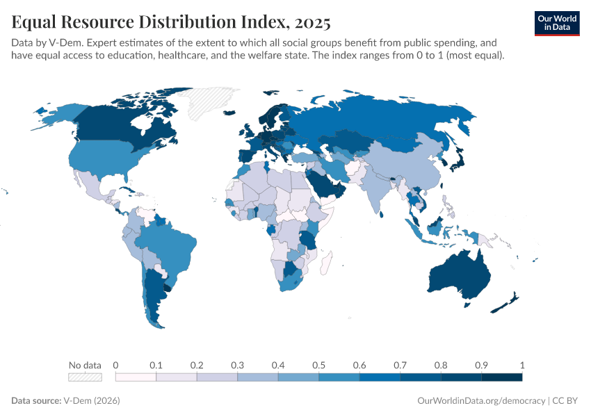 “Data Page: Equal resource distribution index”, part of the following publication: Bastian Herre, Lucas Rodés-Guirao, and Esteban Ortiz-Ospina (2013) - “Democracy”. Data adapted from V-Dem. Retrieved from https://data-forest-share-update.owid.pages.dev:8789/20251209-133038/grapher/equal-resource-distribution-index.html [online resource] (archived on December 9, 2025).How to cite this data