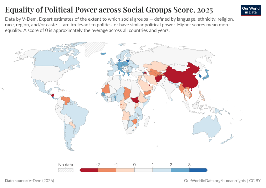 V-Dem (2025) – processed by Our World in Data. “Equality of political power across social groups – V-Dem” [dataset]. V-Dem, “Democracy report v15” [original data]. Retrieved December 29, 2025 from https://data-forest-share-update.owid.pages.dev:8789/20250925-233948/grapher/equality-of-political-power-across-social-groups-score.html (archived on September 25, 2025).