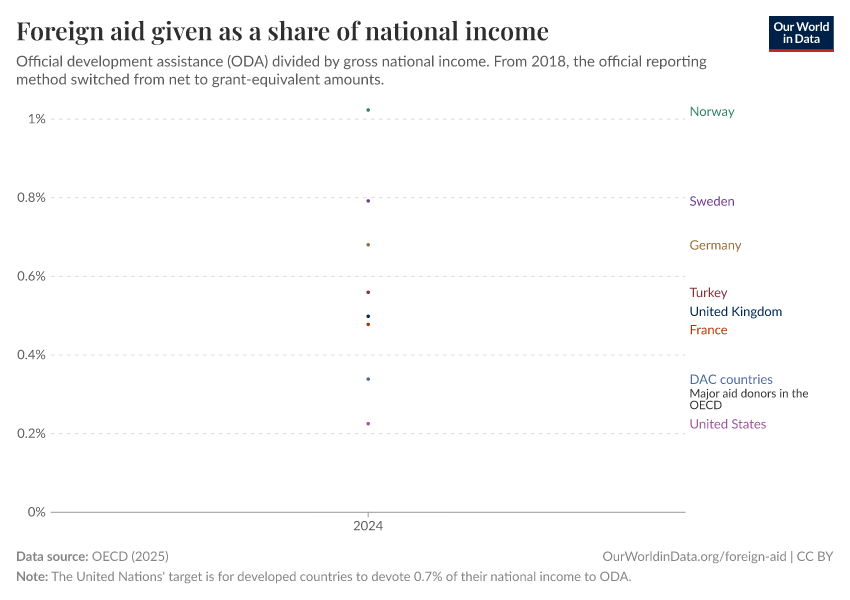 “Data Page: Foreign aid given as a share of national income”, part of the following publication: Bastian Herre, Pablo Arriagada, Simon van Teutem, and Hannah Ritchie (2024) - “Foreign Aid”. Data adapted from OECD. Retrieved from https://data-forest-share-update.owid.pages.dev:8789/20250909-093708/grapher/foreign-aid-given-as-a-share-of-national-income.html [online resource] (archived on September 9, 2025).How to cite this data