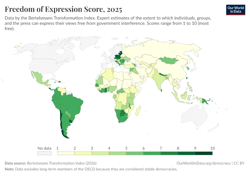 “Data Page: Freedom of expression score”, part of the following publication: Bastian Herre, Lucas Rodés-Guirao, and Esteban Ortiz-Ospina (2013) - “Democracy”. Data adapted from Bertelsmann Transformation Index. Retrieved from https://data-forest-share-update.owid.pages.dev:8789/20251209-133038/grapher/freedom-of-expression-score-bti.html [online resource] (archived on December 9, 2025).How to cite this data