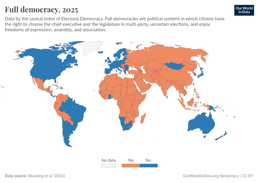 Skaaning et al. (2025) – processed by Our World in Data. “Full democracy” [dataset]. Skaaning et al., “Lexical Index of Electoral Democracy (LIED) v6.8” [original data]. Retrieved December 29, 2025 from https://data-forest-share-update.owid.pages.dev:8789/20250909-093708/grapher/full-democracy-lexical.html (archived on September 9, 2025).