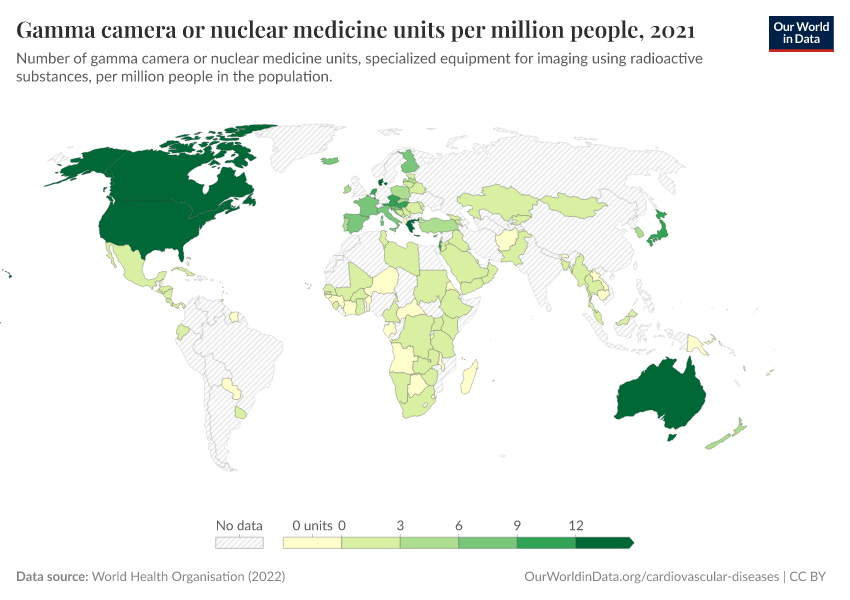 “Data Page: Gamma camera or nuclear medicine units per million people”, part of the following publication: Saloni Dattani, Veronika Samborska, Hannah Ritchie, and Max Roser (2023) - “Cardiovascular Diseases”. Data adapted from World Health Organisation. Retrieved from https://data-forest-share-update.owid.pages.dev:8789/20250909-093708/grapher/gamma-camera-or-nuclear-medicine-availability.html [online resource] (archived on September 9, 2025).How to cite this data