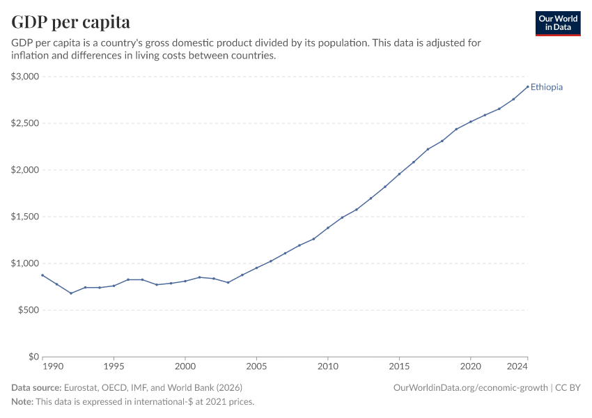 • This data comes from the World Bank and starts in 1990. For estimates going back several centuries, explore our chart of GDP per capita from the Maddison Project Database.